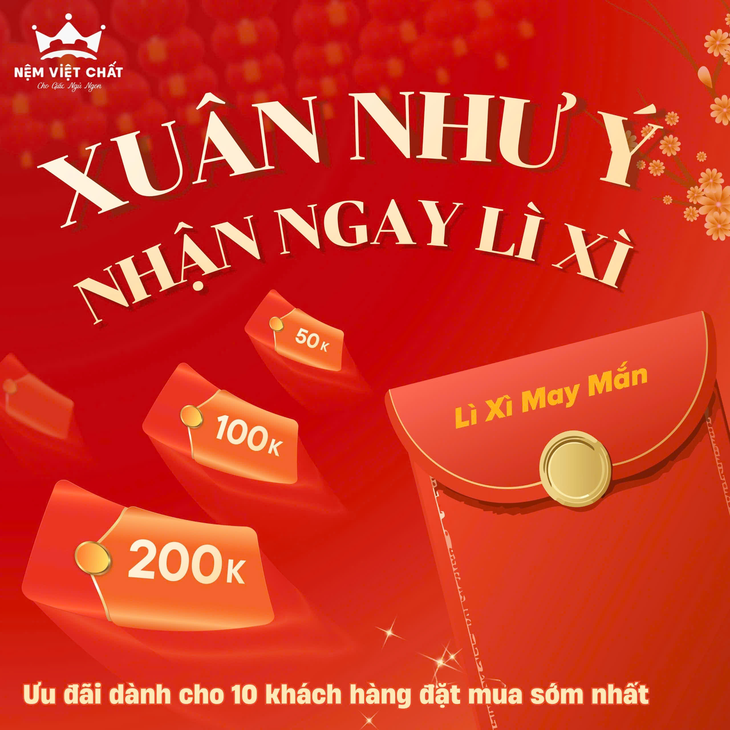 Chương trình "Xuân Như Ý" từ Nệm Việt Chất: Tặng lì xì đến 200K cho 10 khách hàng đặt mua nệm sớm nhất. Sắm nệm êm, nhận lộc xuân ngay!
